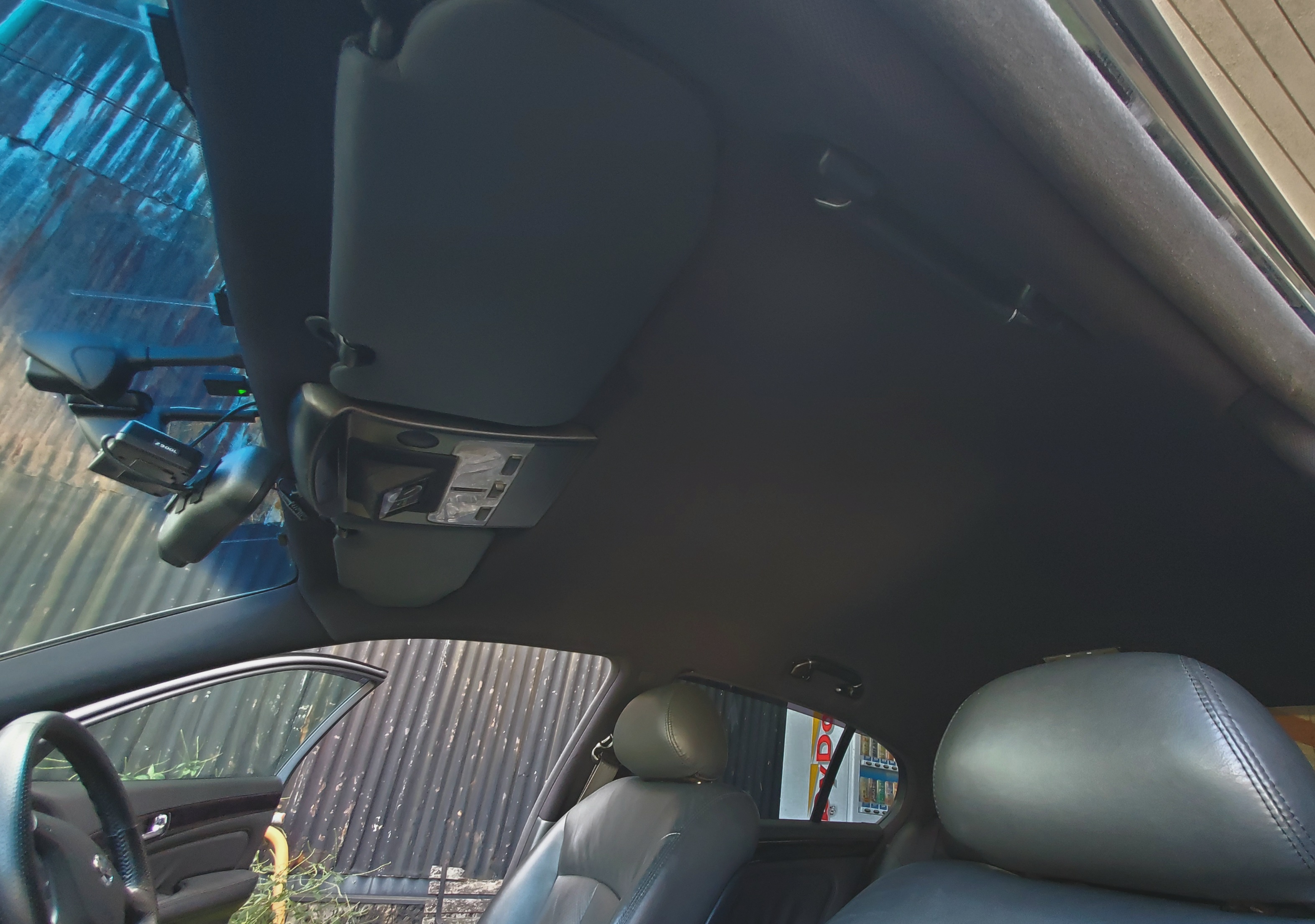 ピラー、サンバイザー、ルームランプ、天井全てブラックに変更、張り替えや塗装にバイザーはブラックレザーで縫製しています 国産、輸入車問わず室内のカラーチェンジやカスタムメイドが可能です
