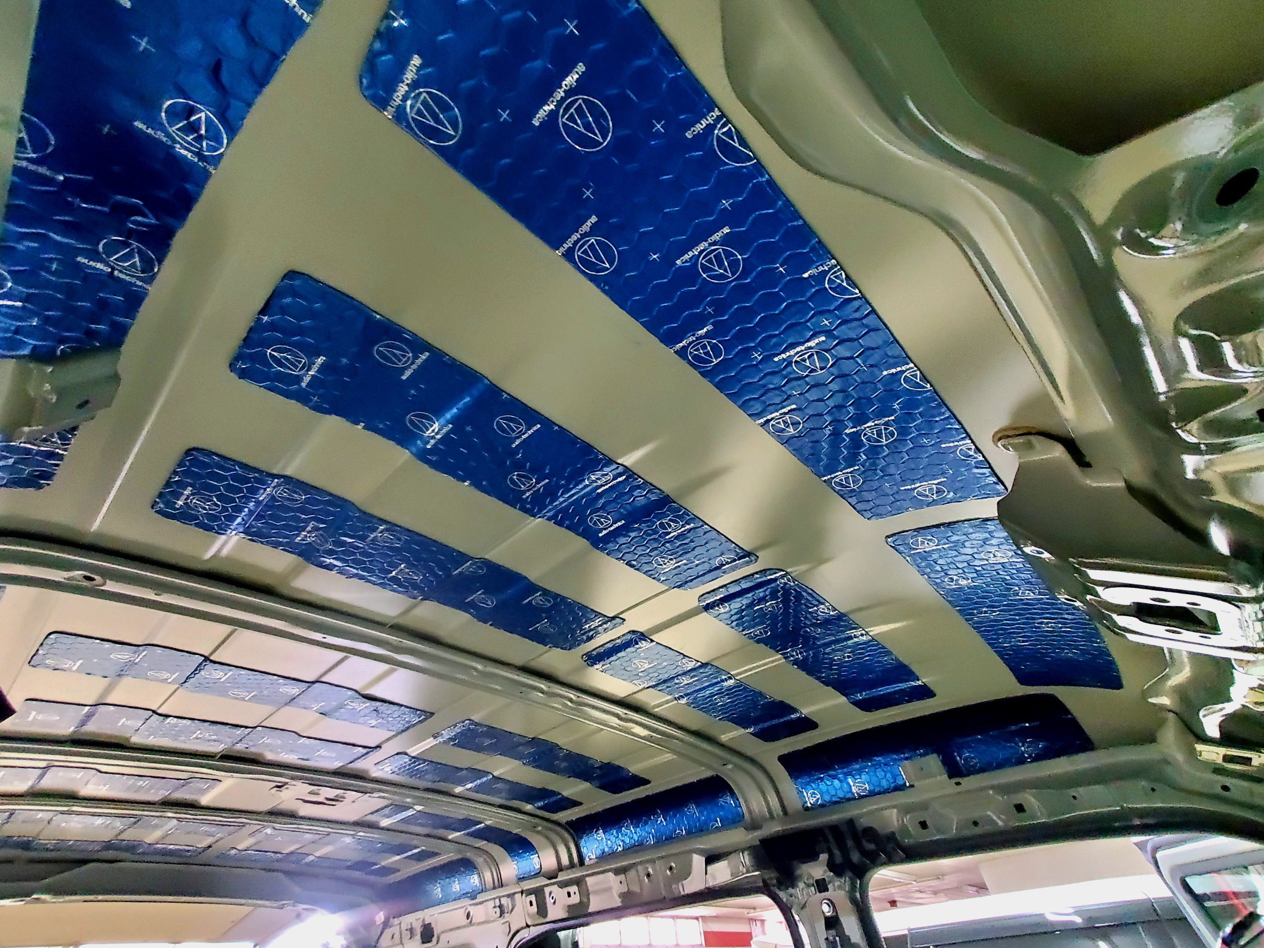 純正では何も対策していない天井を車外に取り外し、ルーフをデッドニングします。 張りすぎは無駄な重量増しとなりますので、バランス良く、面積の6割をめあすにシートを密着させながら張り付けます 国産 オーディオテクニカ製デッドニングシートを当店では使用。少ない使用量で効果を発揮する自動車専用に開発されています