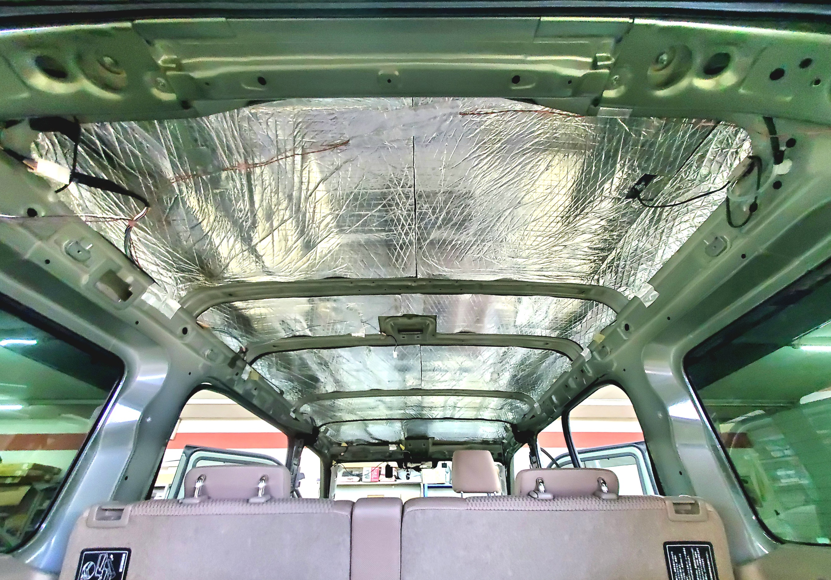 ご要望の多い遮熱断熱施工。通勤、車中泊、旅行、ペットとの長距離ドライブなど様々な用途でのご依頼がありました 酷暑対策として断熱層と遮熱シートが一体化したオーディオテクニカ製 ヒートシールドラグを全面に張り付けしています 夏場は断熱、遮熱効果により涼しく。冬場は遮熱効果により暖かい空気が外に逃げず暖かい室内となります 施工によりオールシーズン効果を体感いただけます エブリイワゴンクラスでデッドニング、遮熱断熱 88,000円〜より承っております